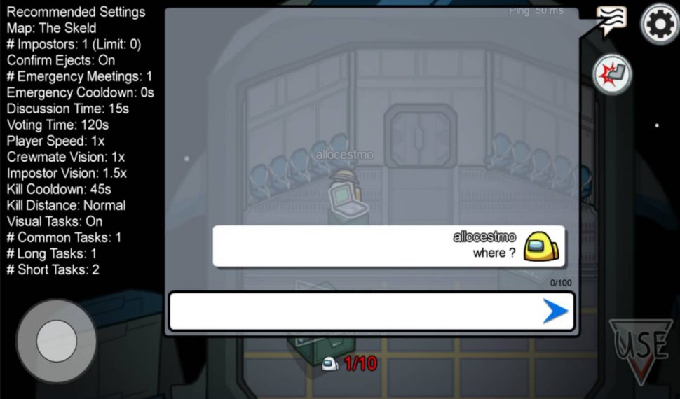 Dentro de la reunión, los jugadores discuten quién creen que es un impostor según la evidencia disponible. Se lleva a cabo una votación de pluralidad, y el jugador elegido es expulsado del mapa y muere. Los jugadores pueden comunicarse en un chat de texto, pero solo durante las reuniones, y solo si están vivos (aunque los fantasmas pueden hablar entre ellos en cualquier momento). El juego no tiene un sistema de chat de voz incorporado. Sin embargo, es común que los jugadores usen programas externos como Discord mientras juegan.